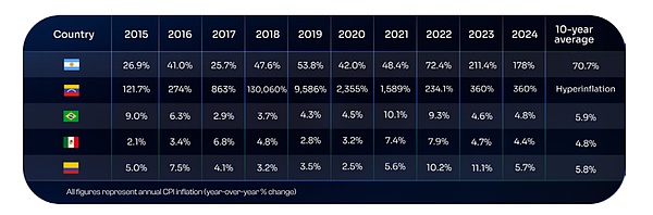 重點我們將關注拉美地區(qū)。這里加密已經(jīng)扎根,已證明新型銀行可以稱王,已是穩(wěn)定幣原生。拉美具備貨幣危機、僑匯依賴、金融排斥等結構性條件,使得Web3新型銀行不僅“有用”,而是“必需”。該地區(qū)每年處理數(shù)萬億美元加密交易,其中50–90%是穩(wěn)定幣支付而非投機。阿根廷178%的通脹率,讓人們對美元計價賬戶求之若渴;每年1600億美元的僑匯在這片土地流動,卻被盤剝式手續(xù)費層層吸血;1.22億人仍無銀行賬戶,卻人人手握智能手機。