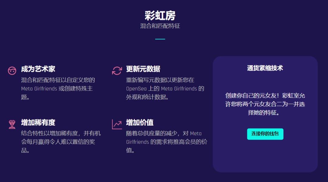 彩虹房,意思就是將2個元女友放進(jìn)去,最后混合一個新的出來。按照官網(wǎng)的解釋,這能夠徹底減少元女友的總量,并隨著時間推移增加總體的價值。