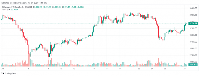 根據CoinGecko數據,Ethereum現貨ETF推出后,ETH跌幅超過10%,觸及3100美元的低點。截至撰寫本文時,ETH的交易價格約為3376美元,在過去24小時內上漲超過4%。