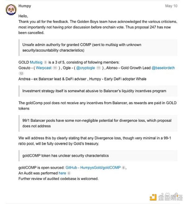 Humpy處理社區反饋如下:承認關于缺乏事先討論的批評并取消提案247;提供GOLD多重簽名的詳細信息;創建具有“Trust Setup”(信托設置)的新提案。