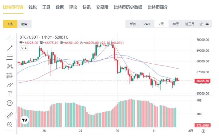 7月31日,據(jù)Blockchain網(wǎng)行情數(shù)據(jù),Bitcoin多頭試圖守住66,500美元的支撐位,但在凌晨失敗,導(dǎo)致午盤后跌至65,526美元的低點(diǎn),空頭尋求測(cè)試65,000美元支撐位的強(qiáng)度。截至發(fā)稿時(shí),Bitcoin價(jià)格回升至66,205美元,24小時(shí)跌幅0.95%。