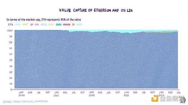 · 第一個途徑是看Ethereum是否會因為L2而損失收入。我們可以通過研究Ethereum生態(tài)收入中Ethereum的收入份額變化的來檢驗這一點。下圖是關(guān)于Ethereum和五個領(lǐng)先L2的收入。Ethereum一直占收入流的90%以上。
